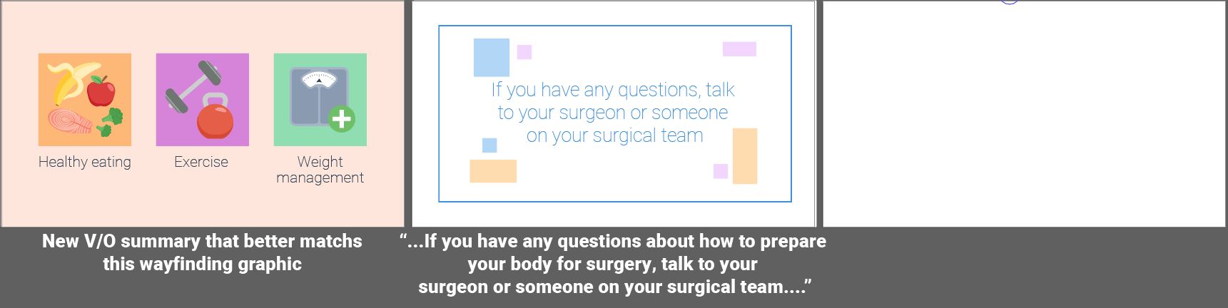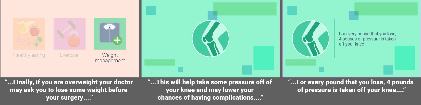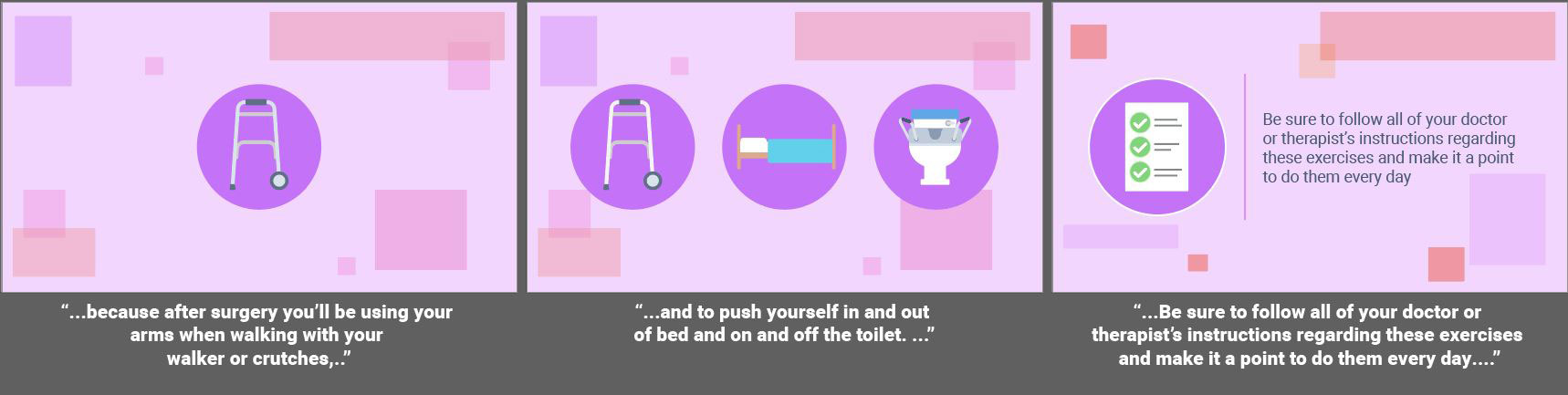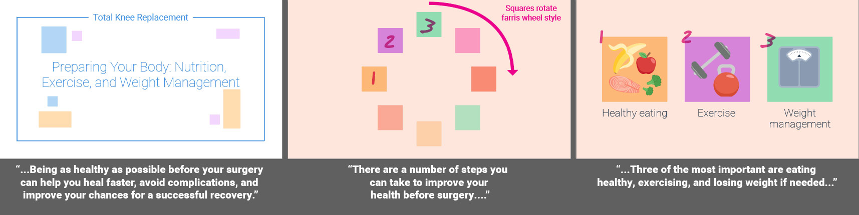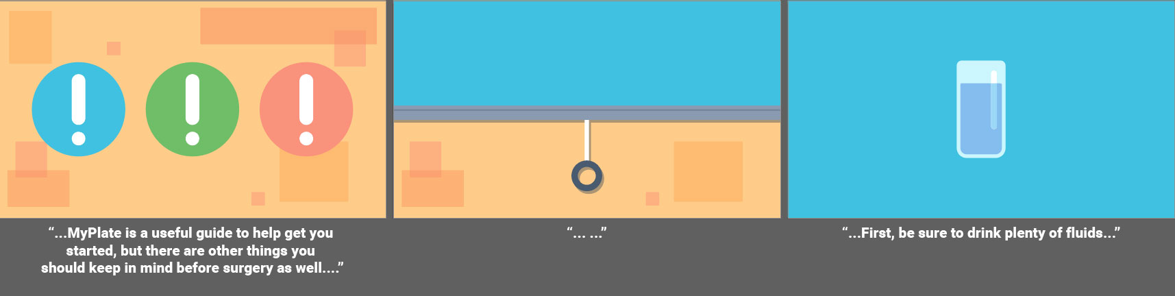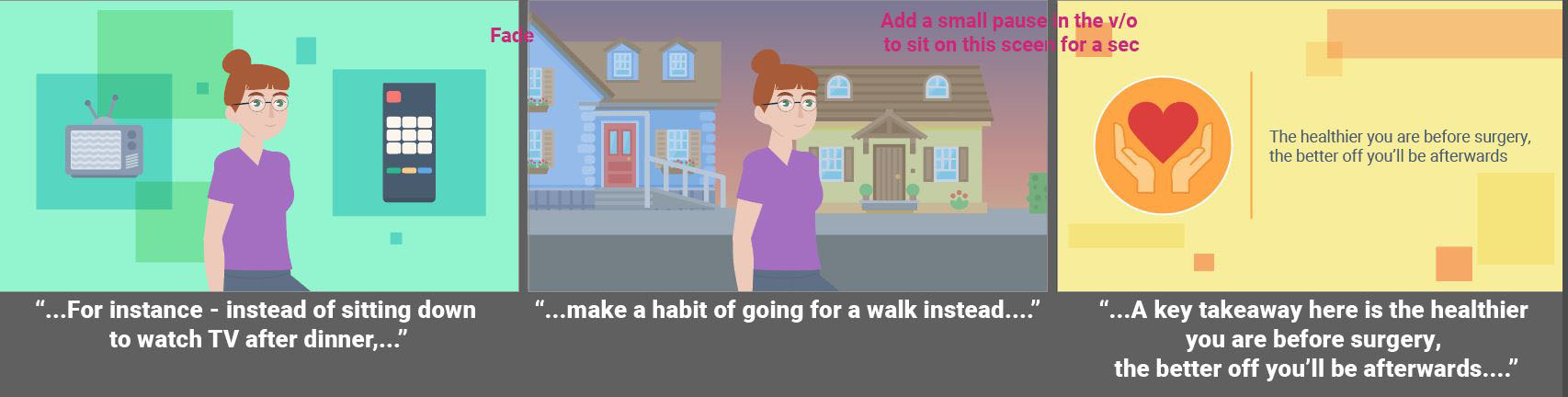 Fully animated videos for a series about total knee replacement to help patients know what to expect before, during and after surgery. I created the storyboards based on a scripted V/O and worked with an animator to create the final videos. As this was a fully animated piece the storyboarding was a bit more in depth then some other types of projects. I relied on coloring for wayfinding throughout the longer video to match the iconography used in representing the different aspects of the topics covered. Since fully animated character work takes much longer on the animator’s part, I used such instances sparingly, and when possible reused scenes or elements from other videos in this series.