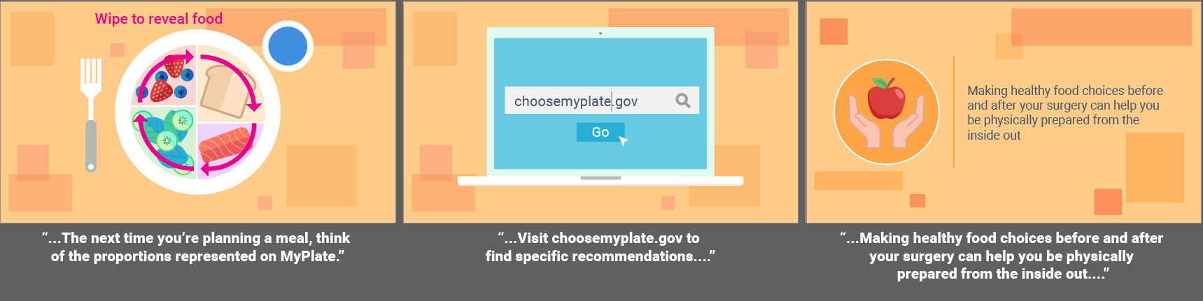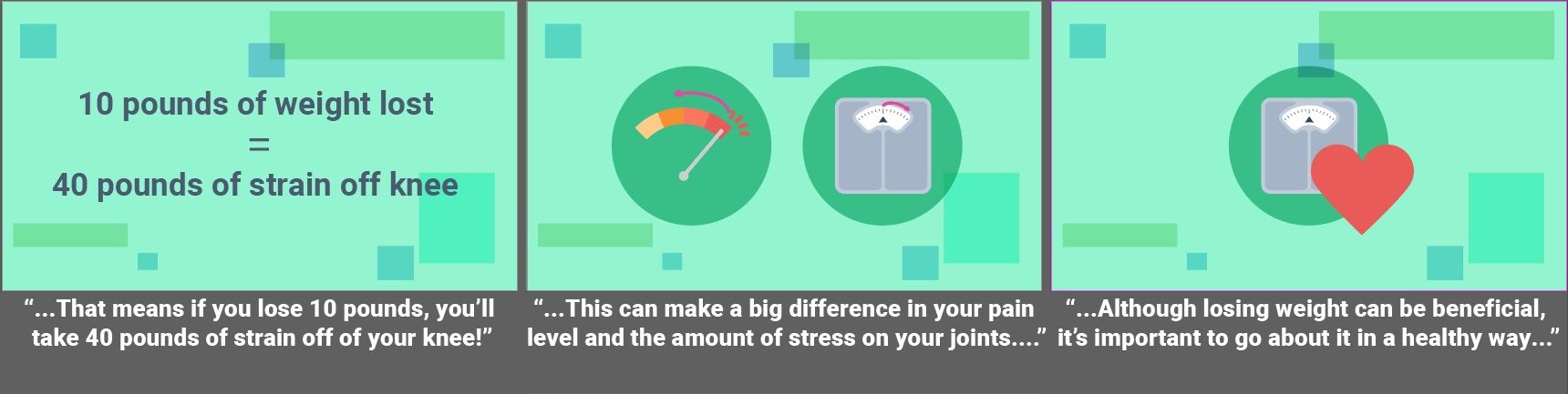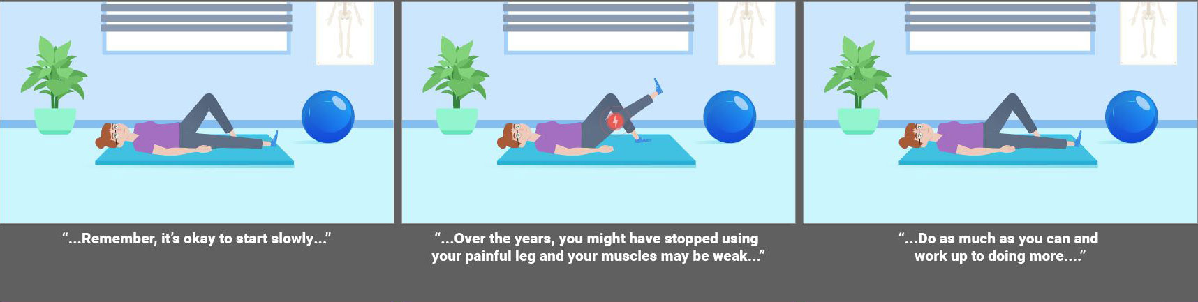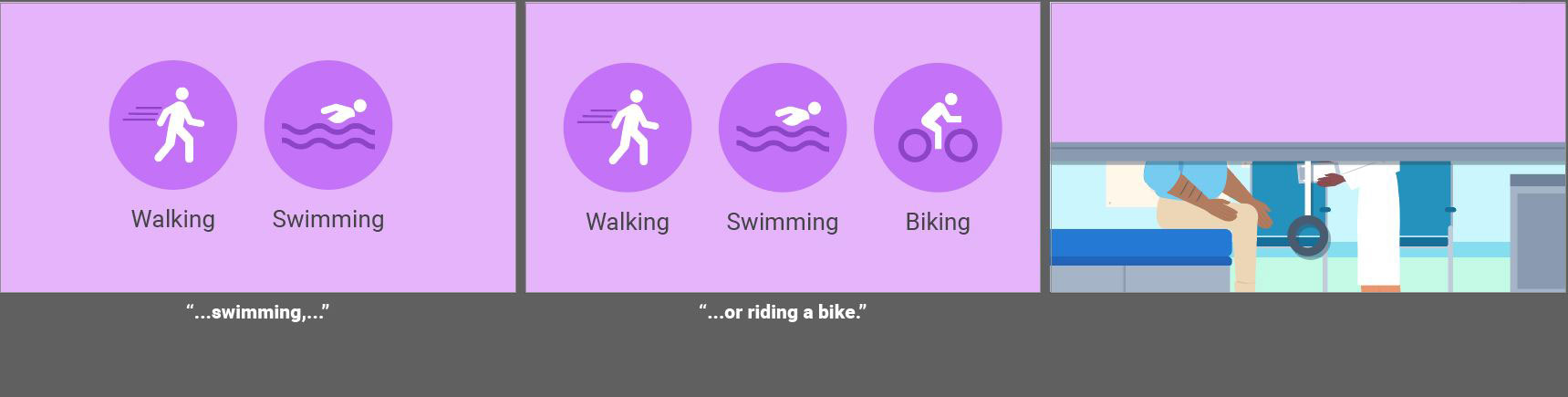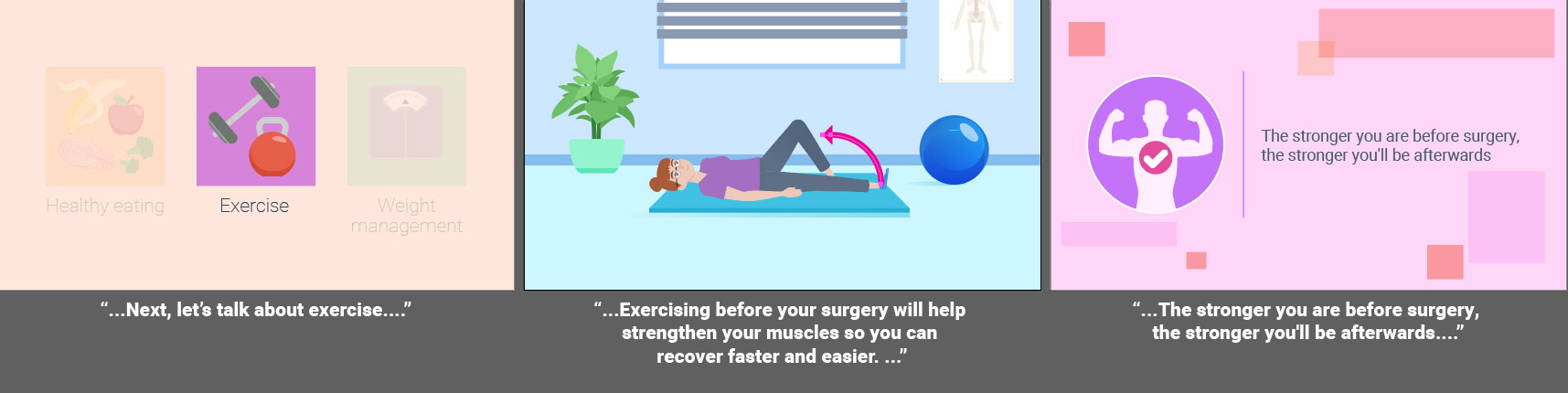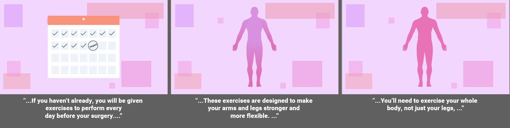 Fully animated videos for a series about total knee replacement to help patients know what to expect before, during and after surgery. I created the storyboards based on a scripted V/O and worked with an animator to create the final videos. As this was a fully animated piece the storyboarding was a bit more in depth then some other types of projects. I relied on coloring for wayfinding throughout the longer video to match the iconography used in representing the different aspects of the topics covered. Since fully animated character work takes much longer on the animator’s part, I used such instances sparingly, and when possible reused scenes or elements from other videos in this series.