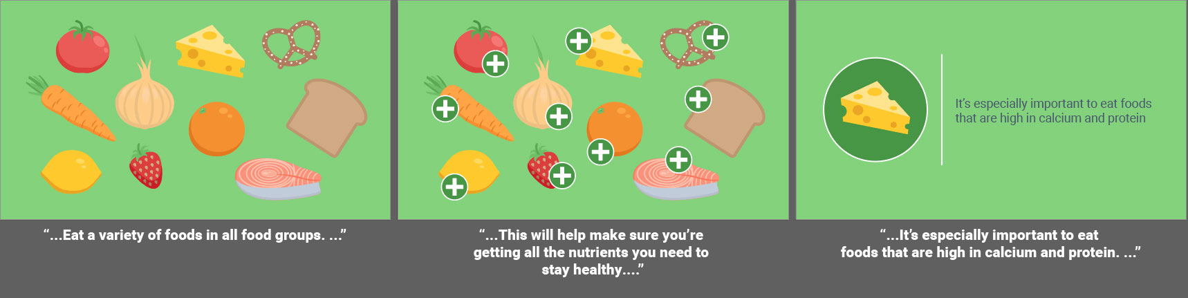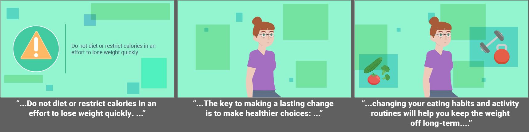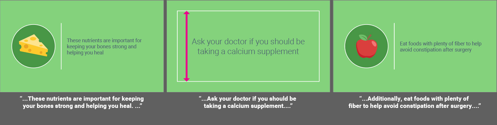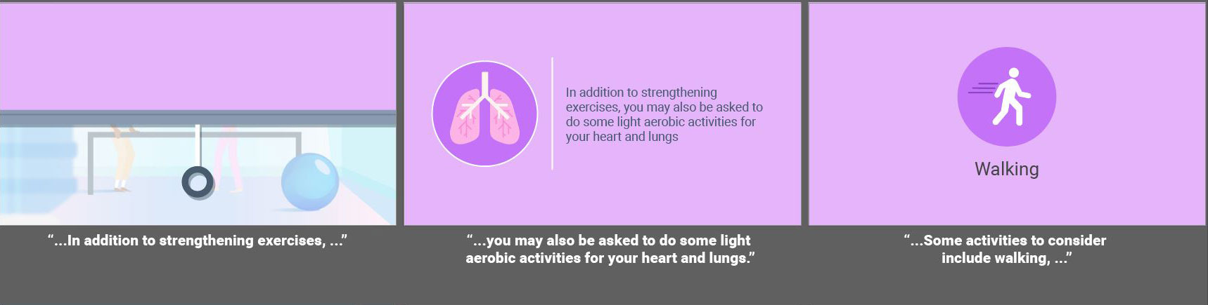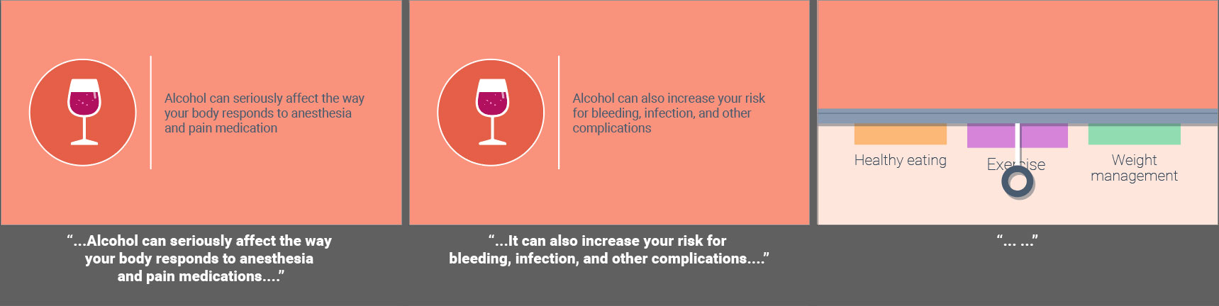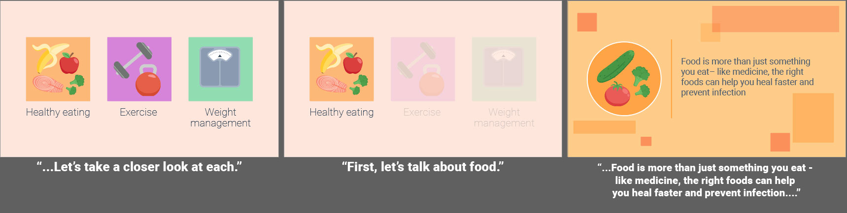 Fully animated videos for a series about total knee replacement to help patients know what to expect before, during and after surgery. I created the storyboards based on a scripted V/O and worked with an animator to create the final videos. As this was a fully animated piece the storyboarding was a bit more in depth then some other types of projects. I relied on coloring for wayfinding throughout the longer video to match the iconography used in representing the different aspects of the topics covered. Since fully animated character work takes much longer on the animator’s part, I used such instances sparingly, and when possible reused scenes or elements from other videos in this series.