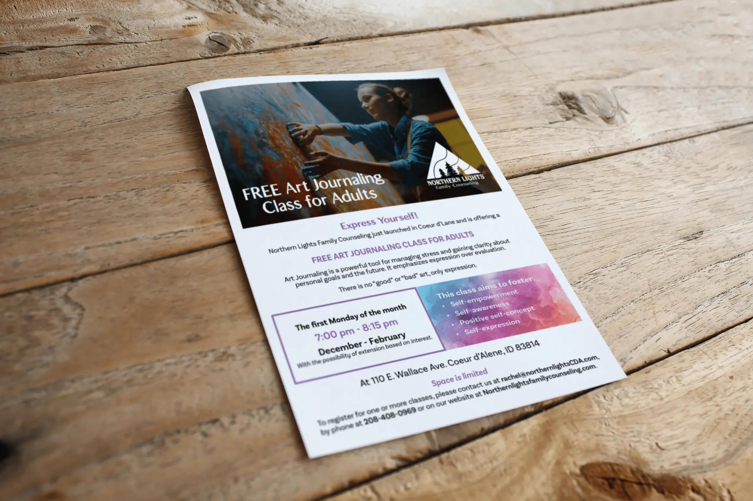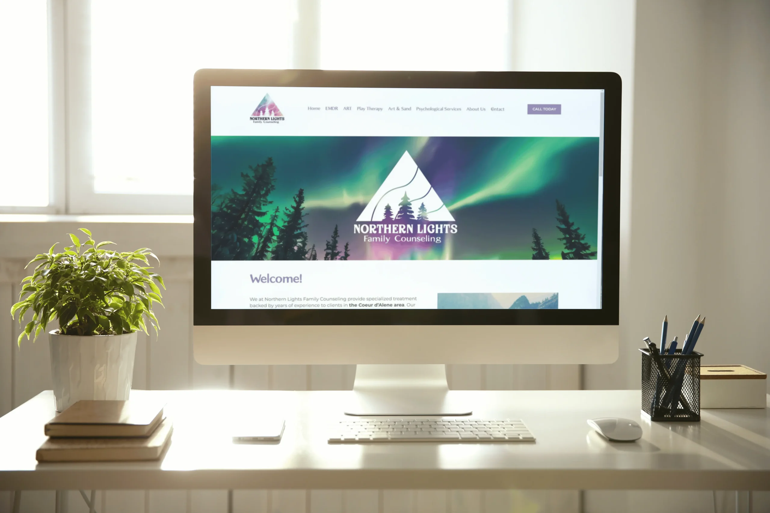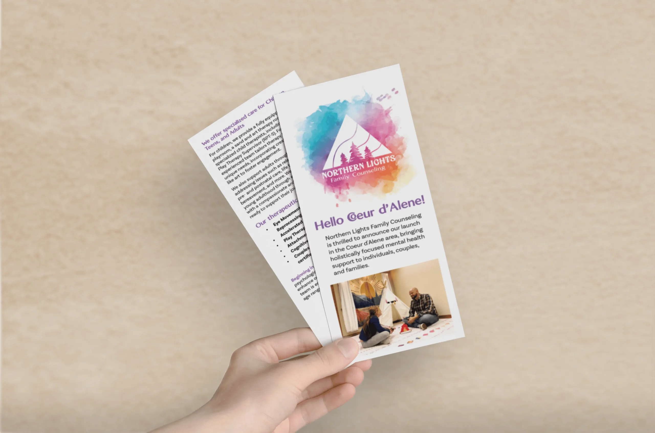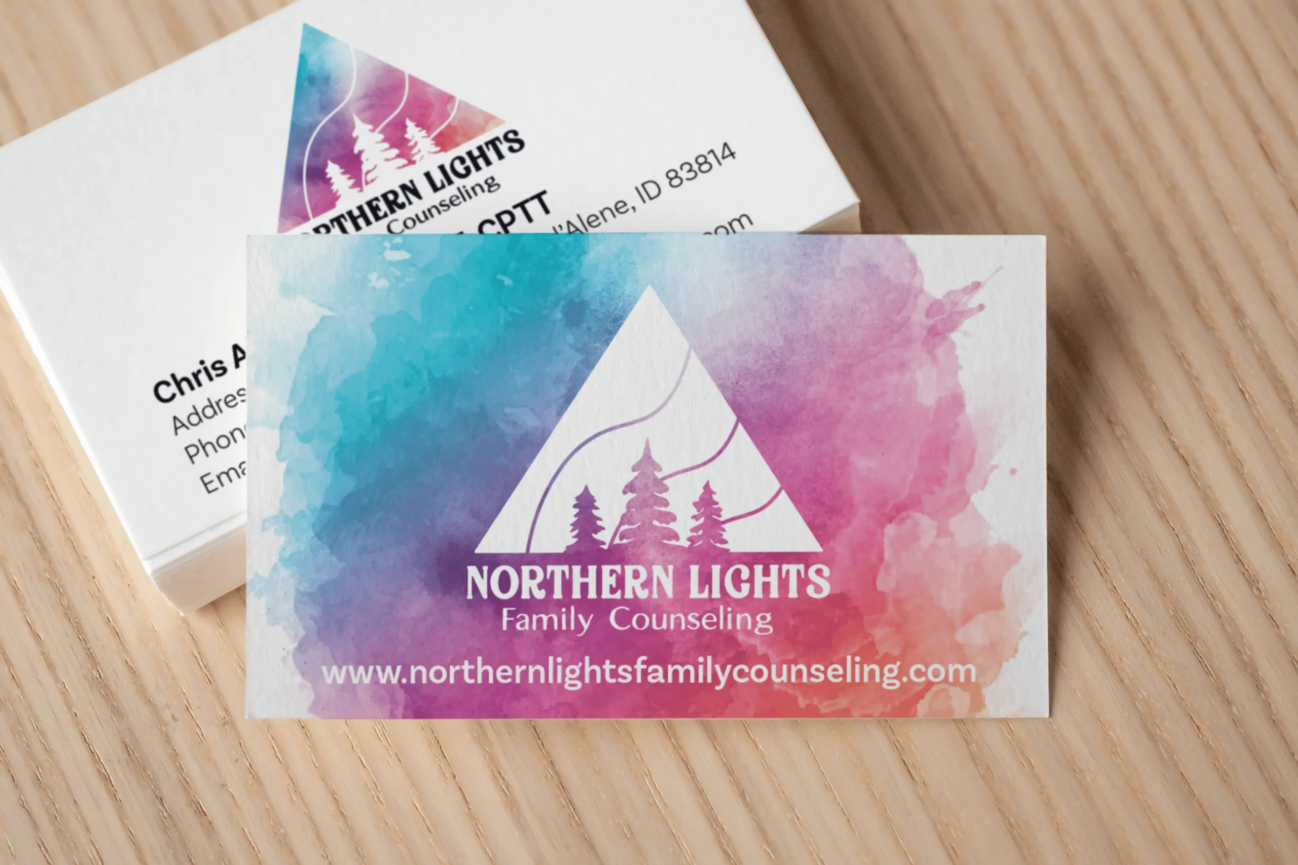 Branding and website design for Northern Lights Family Counseling. The clinic’s branding is very influenced by the natural beauty of scenic location, situated in northern Idaho, with the shapes meant to invoke a mountain with trees with the northern lights flowing above them. Art therapy is a very integral part of their modalities, and so watercolor textures were highlighted in the branding and marketing materials.