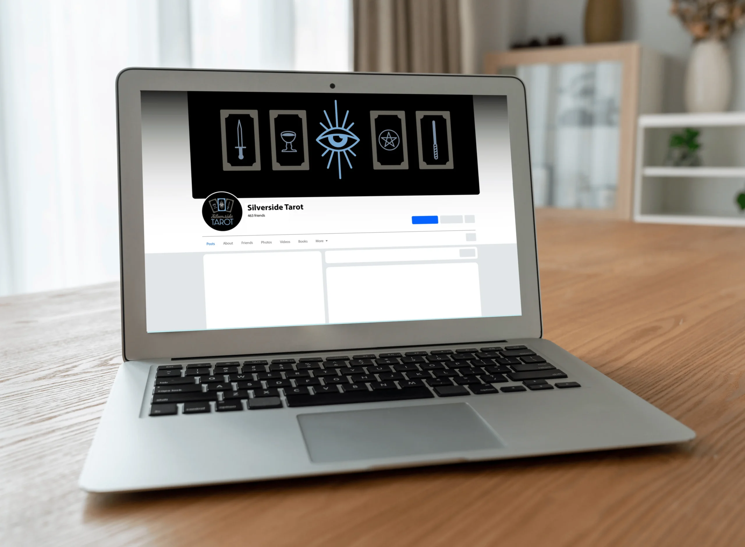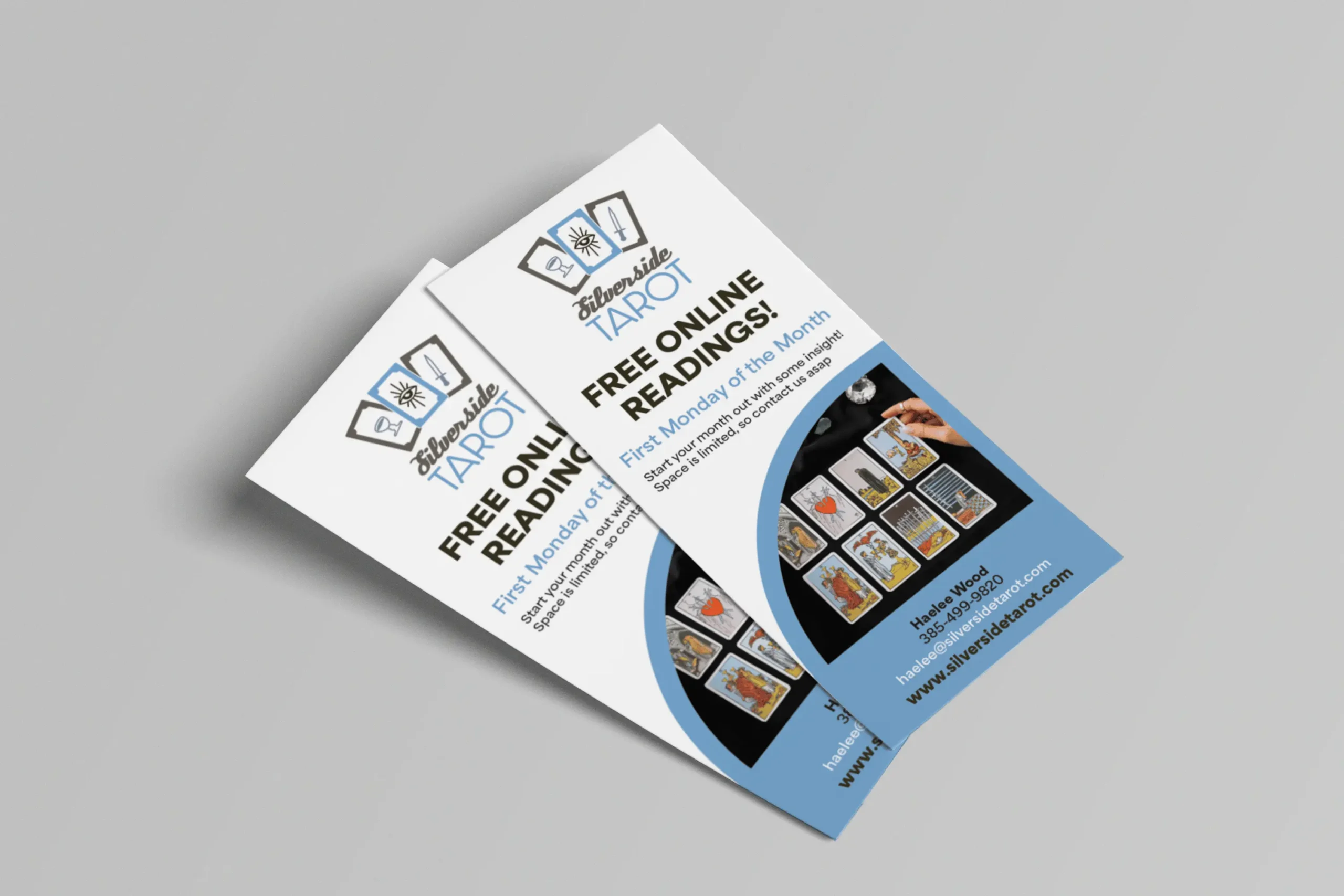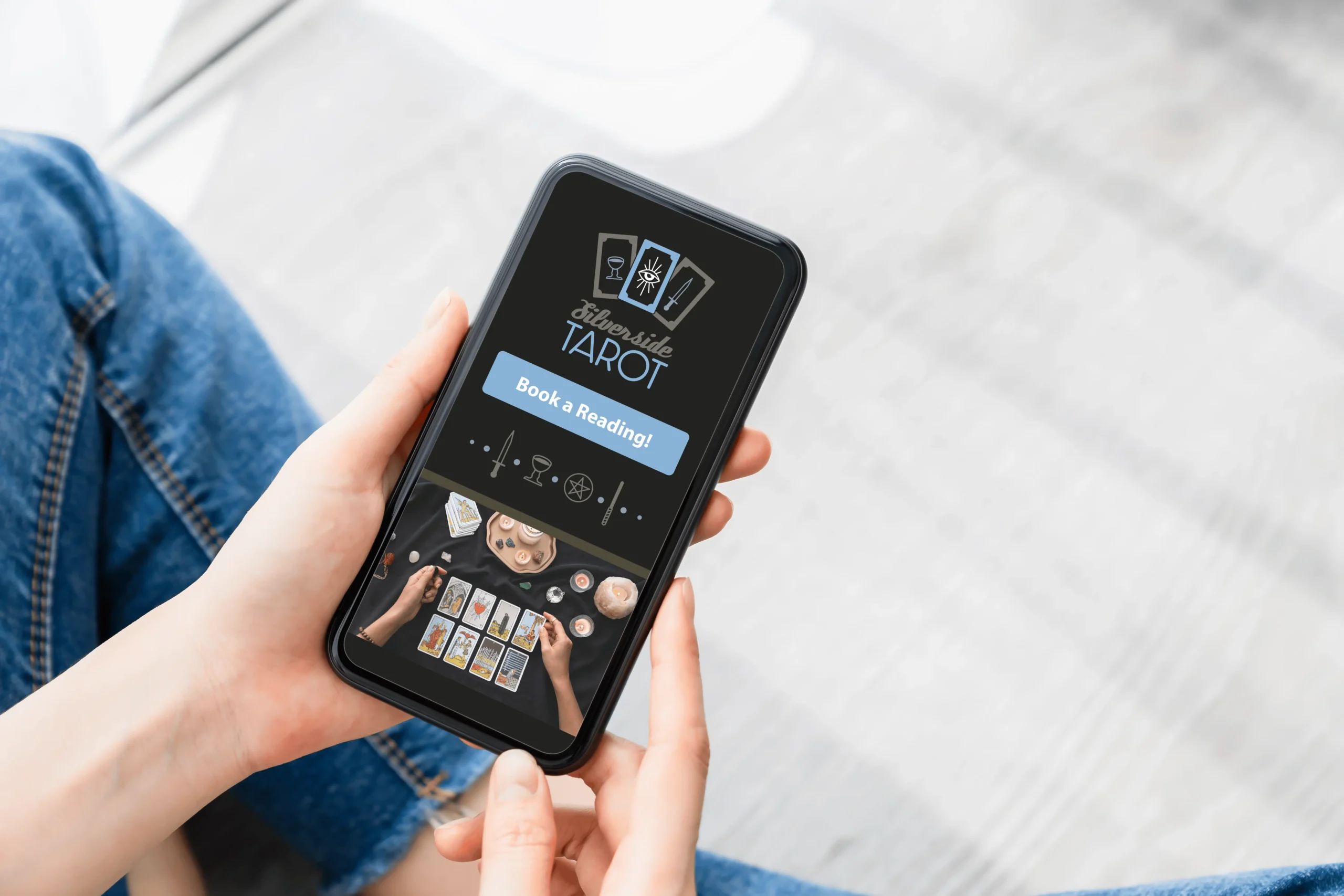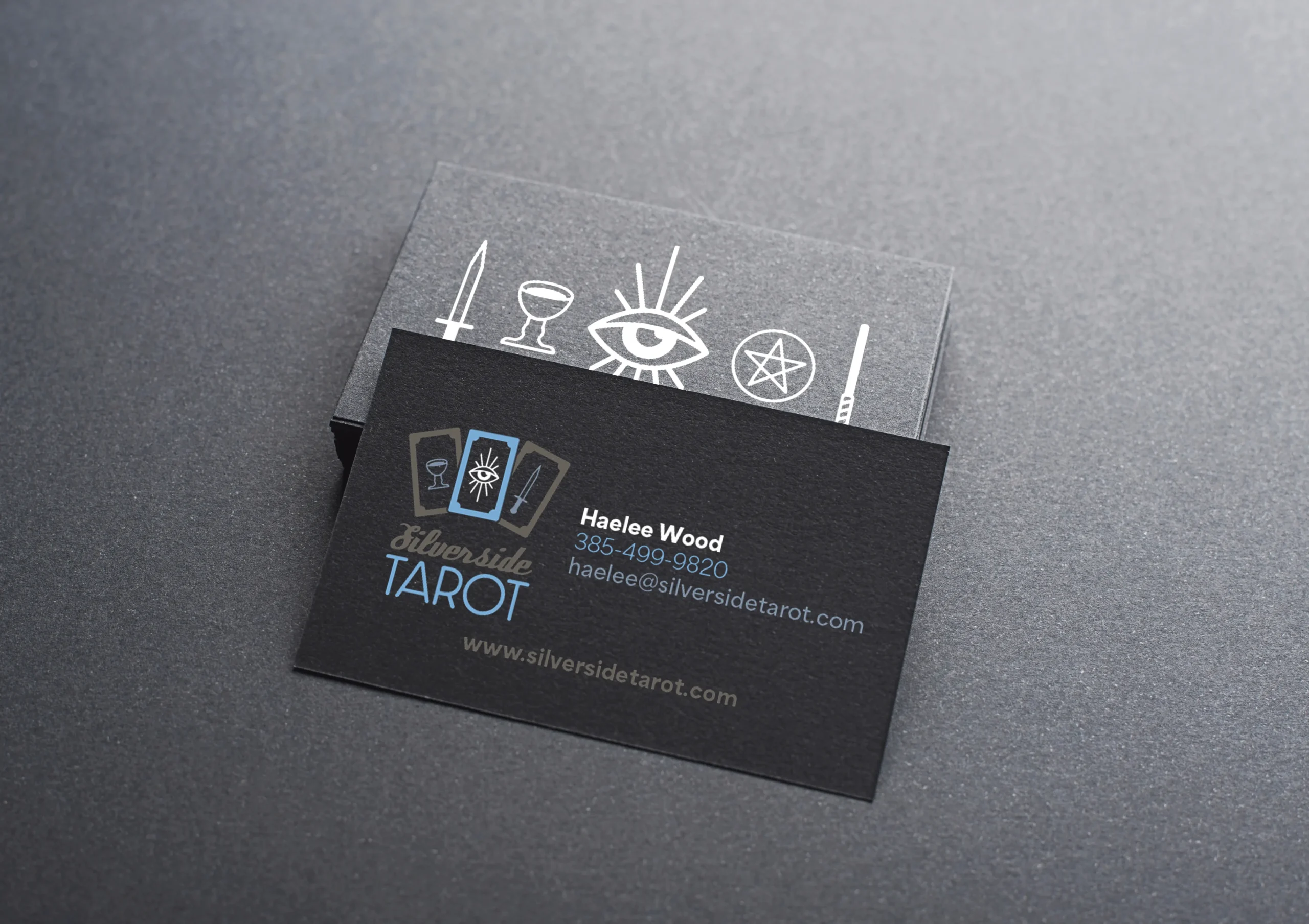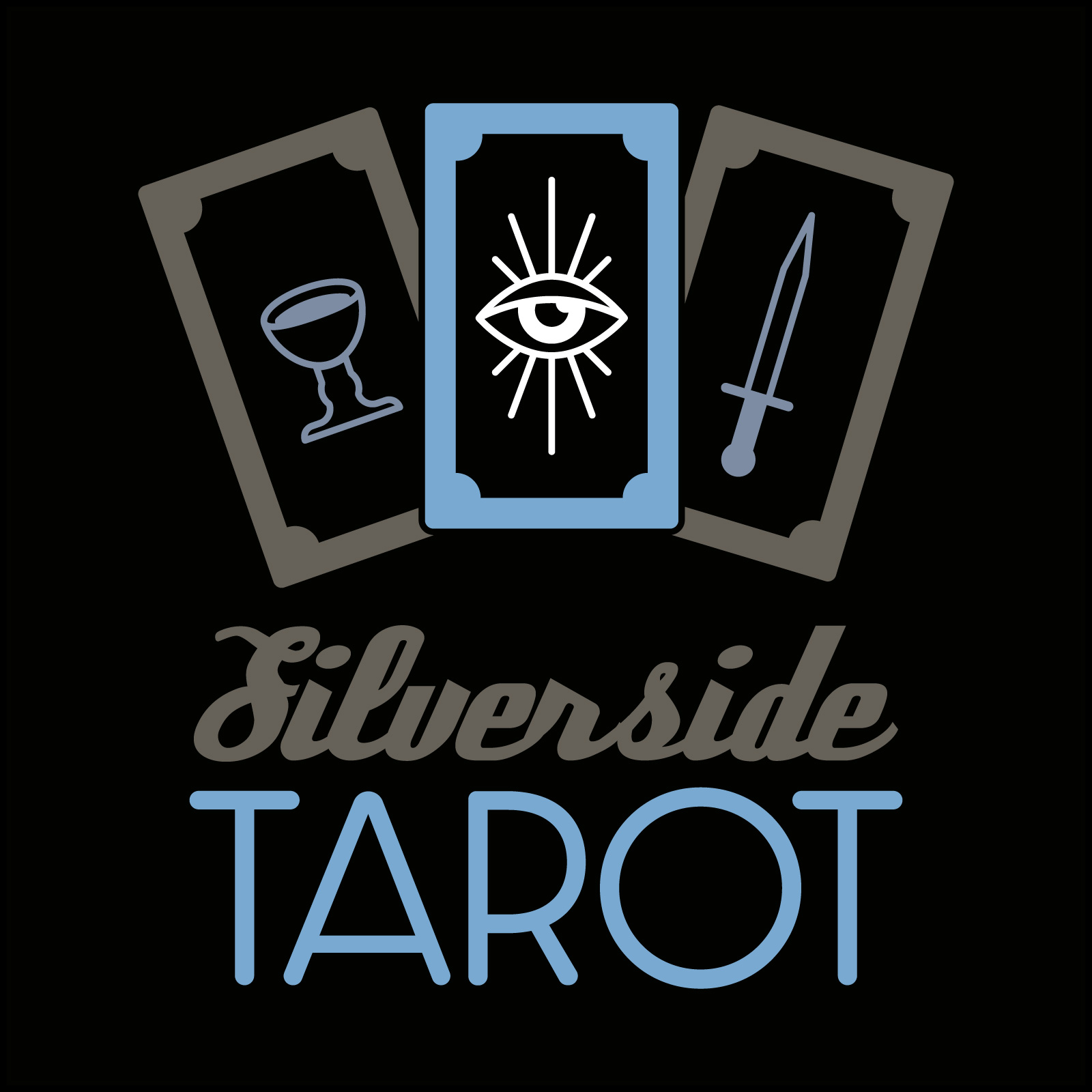 Logo and branding for Silverside Tarot. Silverside is a mostly online business, so the focus was on social media and mobile website marketing. Featuring icons for each of the four Tarot suits (sword, wand, cup, and pentacle) and utilizing them into the logo and other banding materials. The client wanted a darker color pallet with a nod to Tarots ancient origins, but with a clean modern feeling.